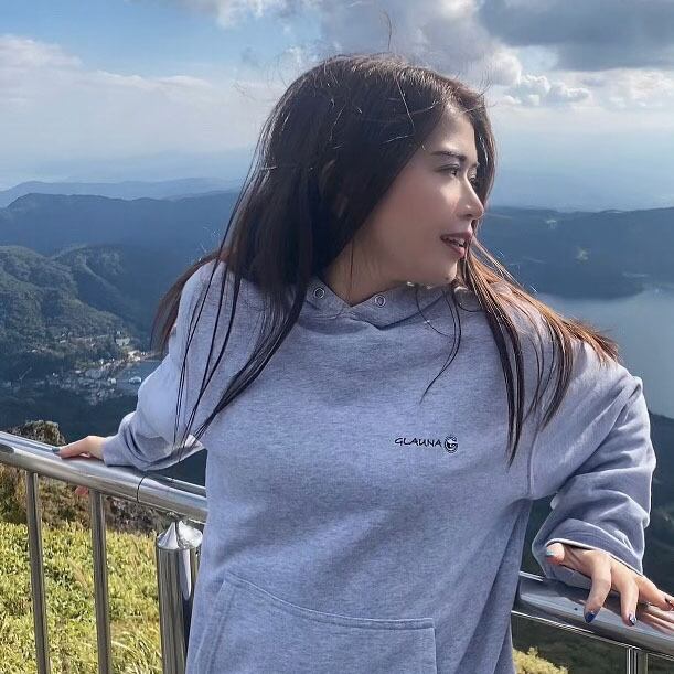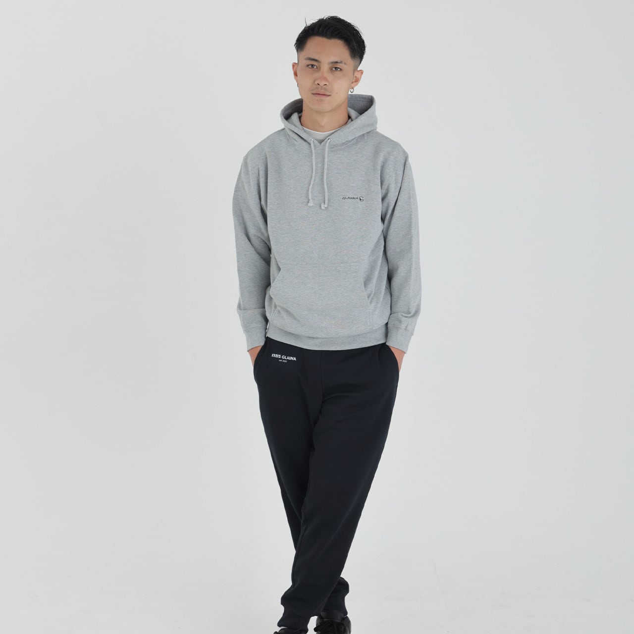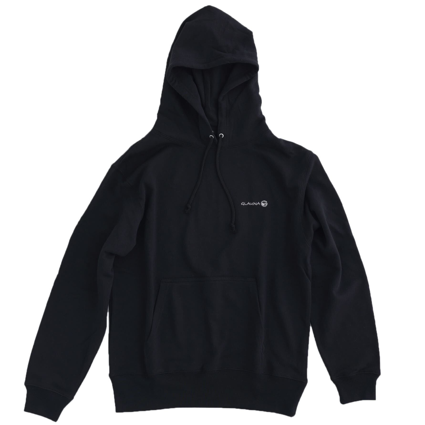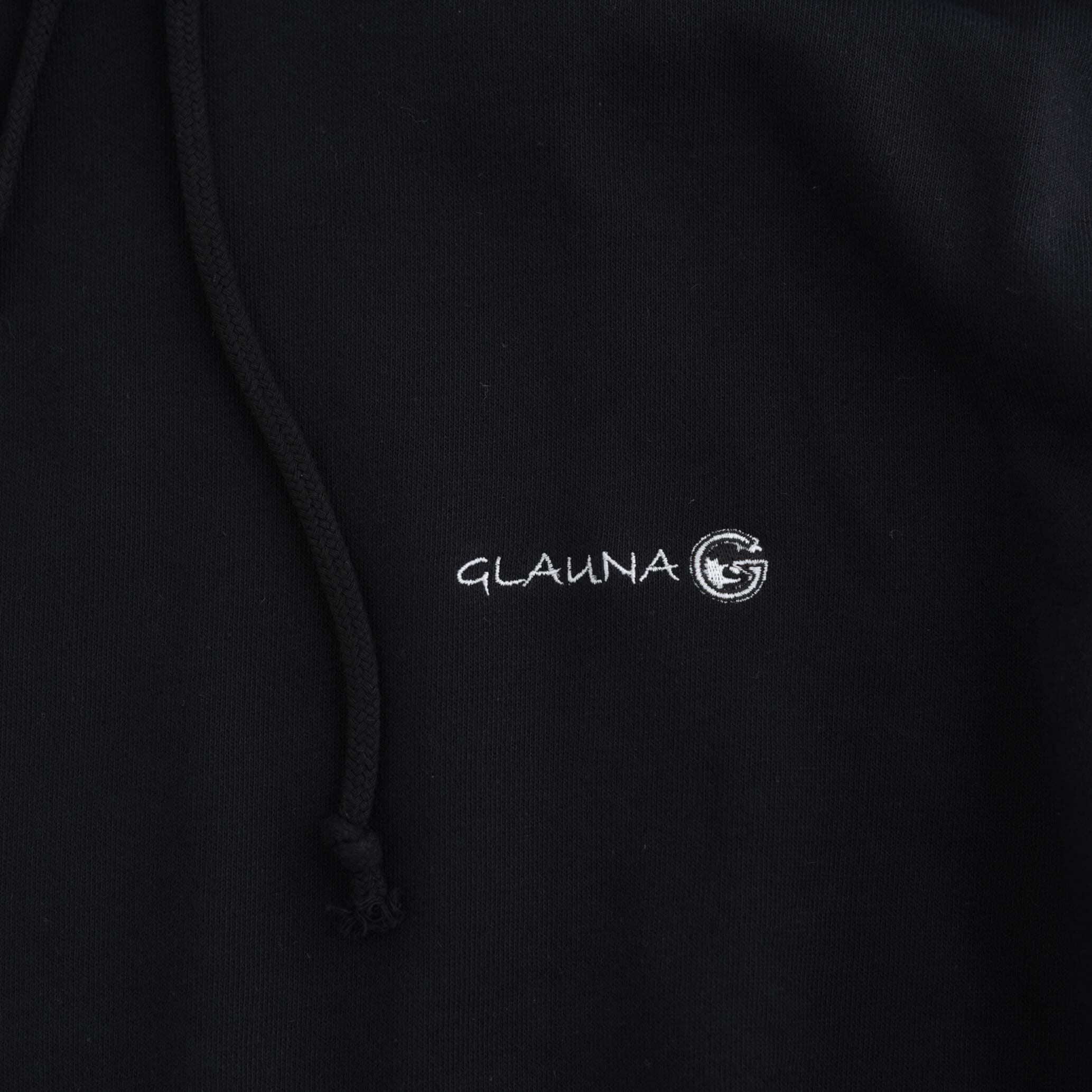 左胸に"GLAUNA"の文字が刺繍されたスウェットパーカー。