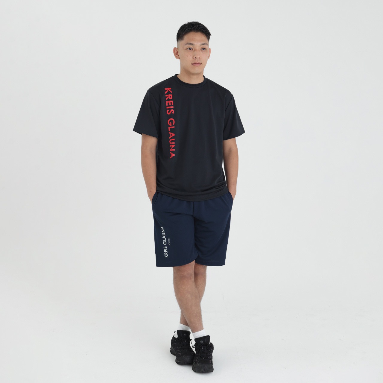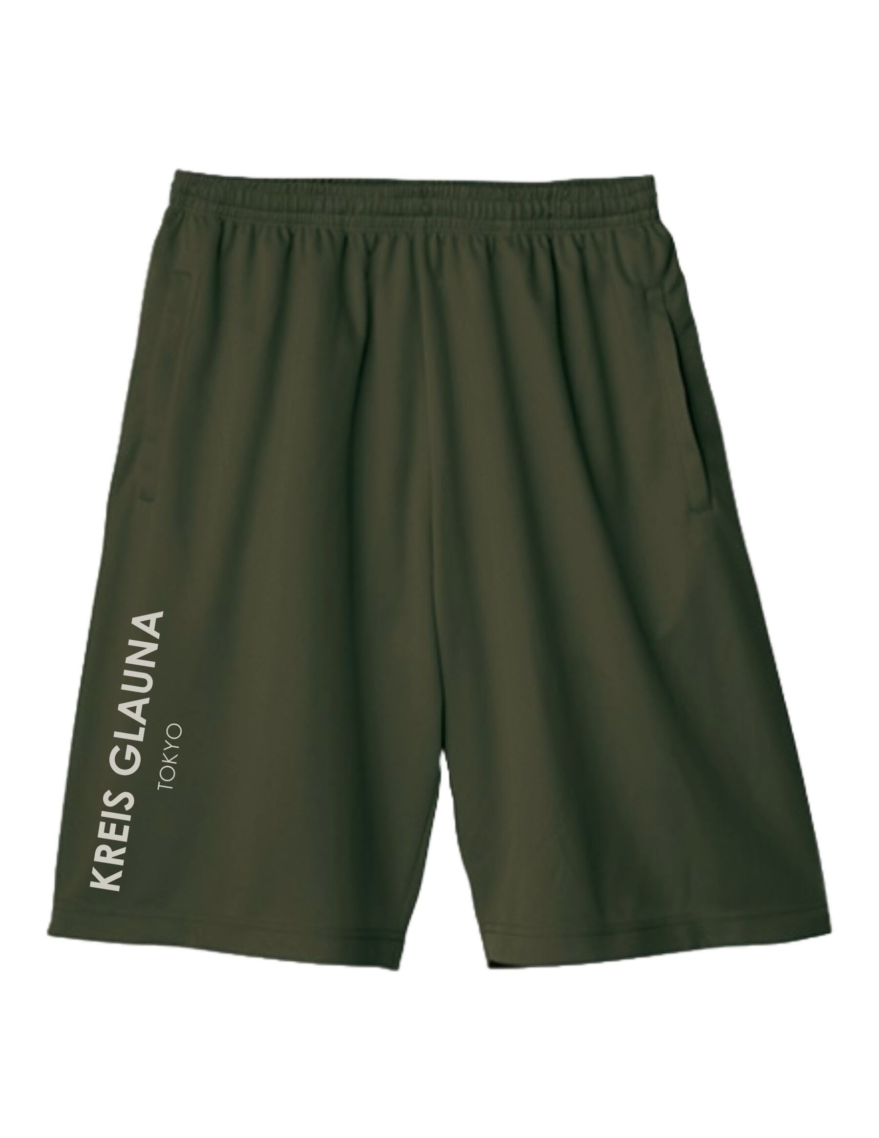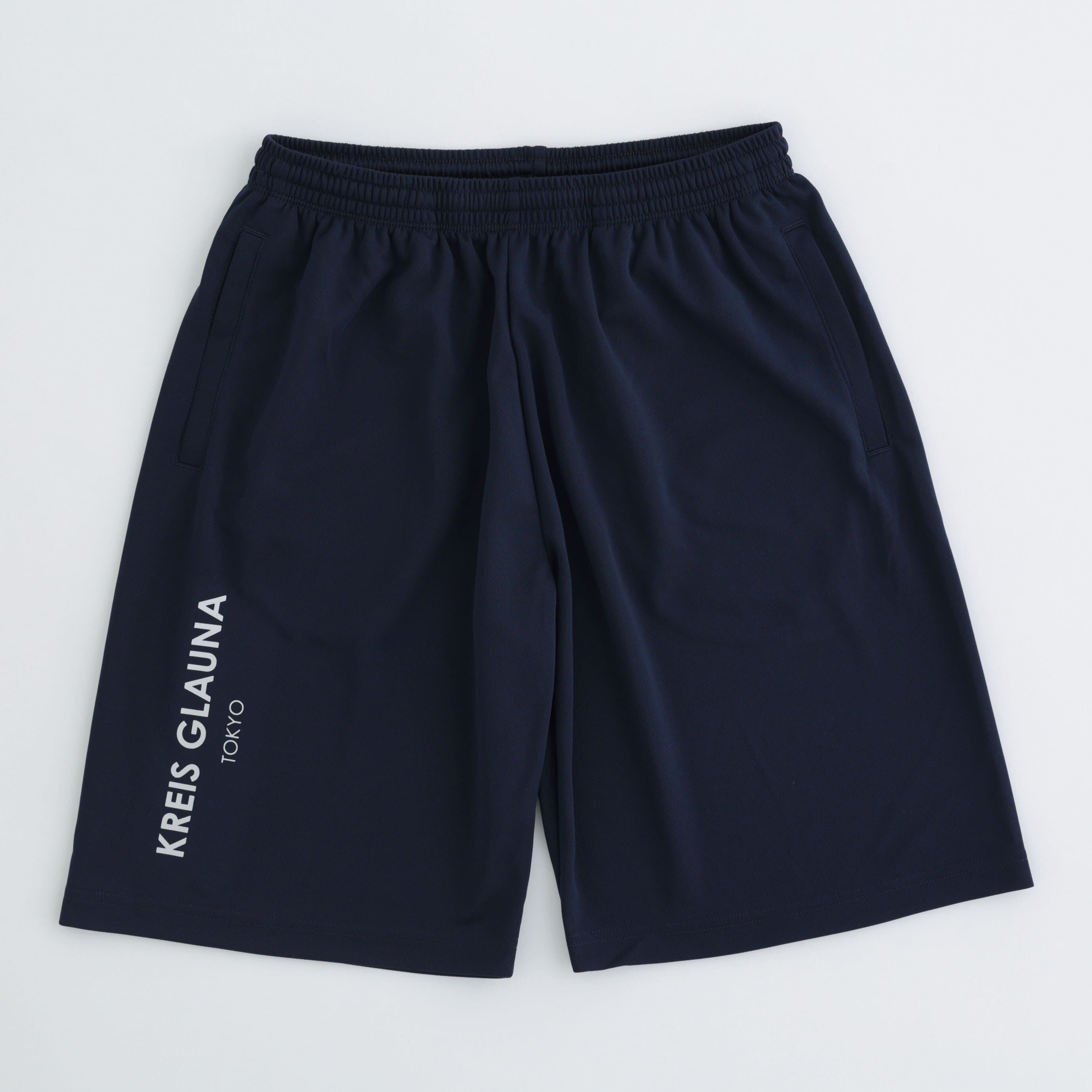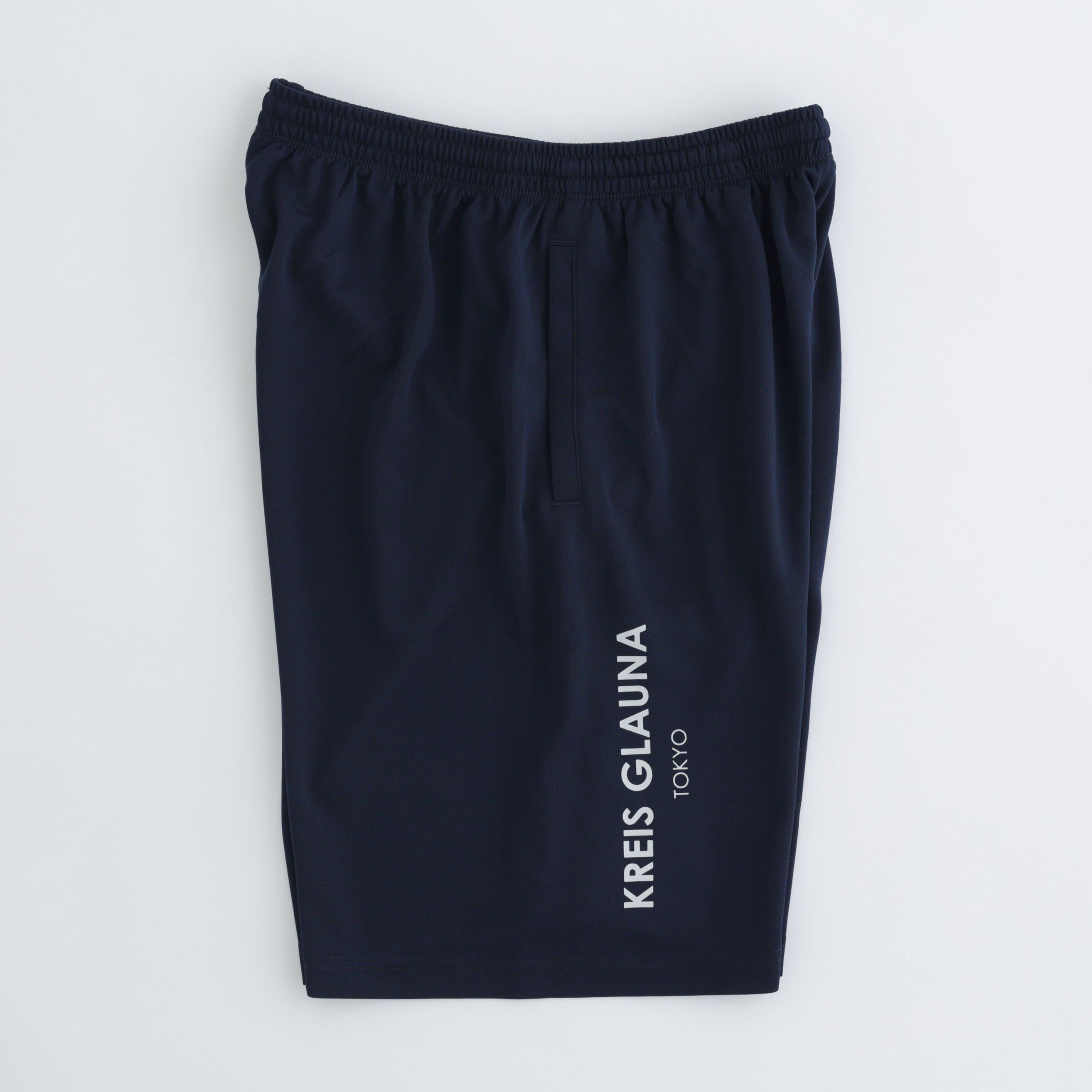 KREIS GLAUNAのロゴをバーティカルに配置したハーフパンツ。